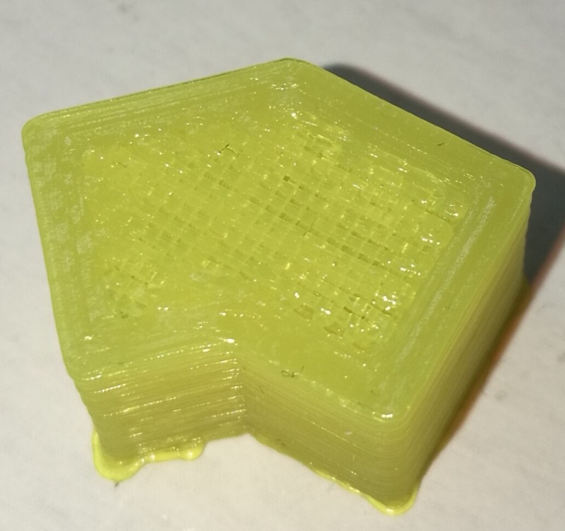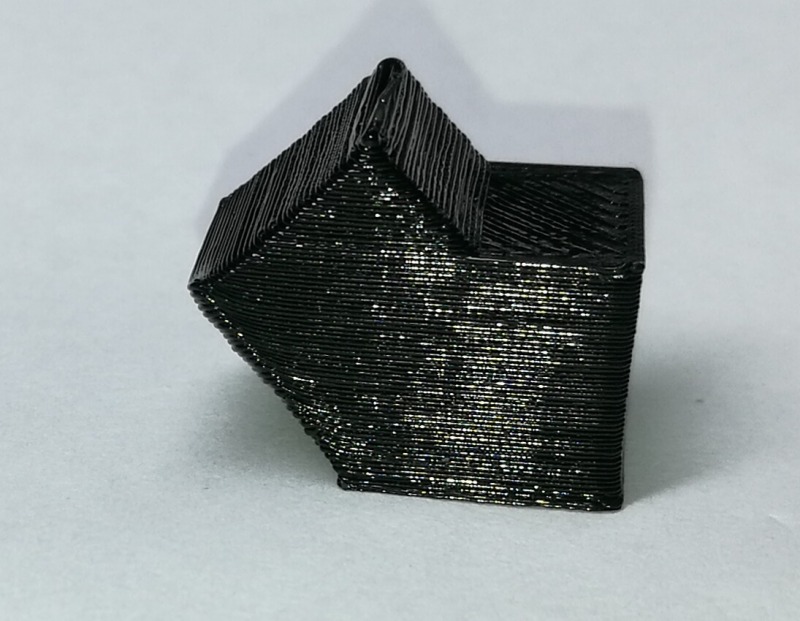 Ohne Zusatz-Lüfter auf die Druckdüse (Cooling-Fan) wird das Filament zu langsam fest, das Druckbild schaut dann in etwa so aus:
