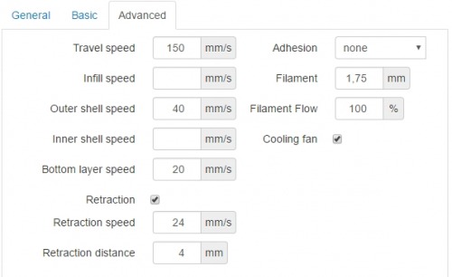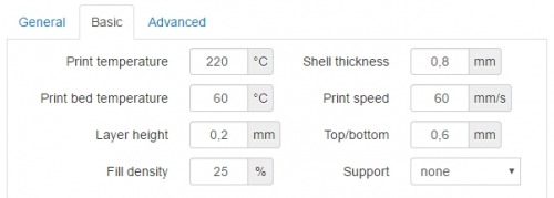In OctoPrint habe ich folgende Einstellungen für das Slicen verwendet, als Material zuerst PLA, dann PETG