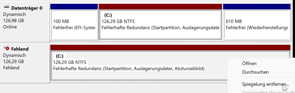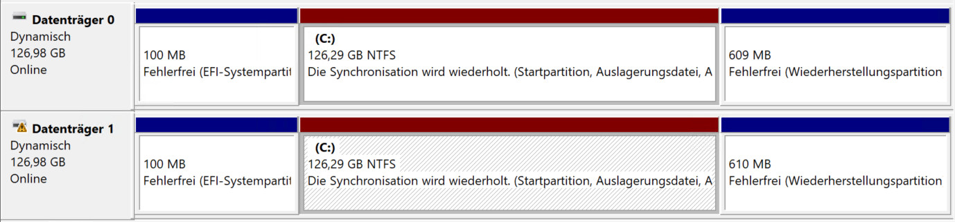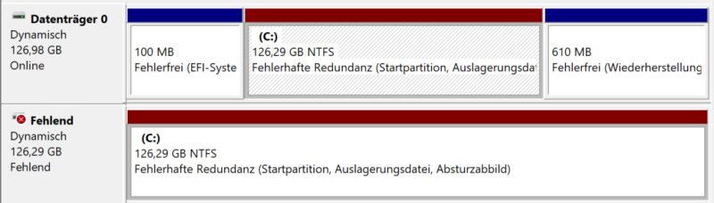 Als Grundlage fĂŒr das Spiegeln muss die Festplatte in einen dynamischen DatentrĂ€ger umgewandelt werden. UrsprĂŒnglich waren dynamische DatentrĂ€ger eine Innovation, heute sind diese eher exotisch und mehr ein Relikt aus vergangenen Zeiten. Auch wenn die Konvertierung eines BASIS-DatentrĂ€gers auf dynamisch in der Praxis meist keinen Unterschied macht, sollte die Umwandlung kurz bedacht werden, da sie nicht mehr so einfach rĂŒckgĂ€ngig gemacht werden kann. Das Spiegeln der Windows-Partition (c:) ist zunĂ€chst eine sehr einfache Sache und funktioniert beinahe selbsterklĂ€rend. Alles andere als selbsterklĂ€rend ist der Umgang mit den zusĂ€tzlichen Boot- und Systempartitionen. Um den Rechner fĂŒr den Ausfall der primĂ€ren Festplatte vorzubereiten, mĂŒssen die Systempartitionen in der richtigen Reihenfolge angelegt werden. Damit die sekundĂ€re Festplatte die gleichen Paritions-IDs bekommt, darf diese erst zuletzt auf dynamisch konvertiert werden. Da das Spiegeln der C-Festplatte die Partition selbstĂ€ndig auf der zweiten Festplatte anlegt, diese sich aber standardmĂ€Ăig nicht am Ende der Platte befindet, ist das ein wenig sowas wie ein Henne-Ei-Problem. Lösen konnte ich das Problem erst, indem ich fĂŒr den Spiegel auf der zweiten Festplatte eine Partition mit der exakten GröĂe der C-Partition als Platzhalter angelegt, und diese spĂ€ter wieder entfernt habe.