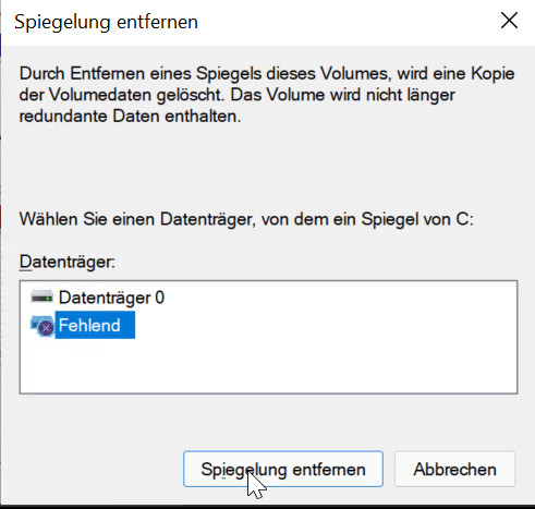 Sollte der DatentrĂ€ger dauerhaft nicht mehr verfĂŒgbar sein, kann dieser mit "Spiegelung entfernen" permanent entfernt werden:Â