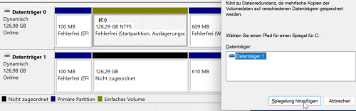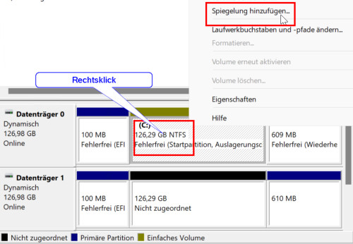 | Spiegelung hinzufĂŒgen | Rechtsklick auf das c-Laufwerk der primĂ€ren Festplatte |