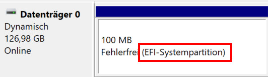 Ob EFI im Einsatz ist, kann am einfachsten in der DatentrÀgerverwaltung festgestellt werden. Im Fall von UEFI befindet sich zu Beginn der Boot-Festplatte eine EFI-Systempartition: