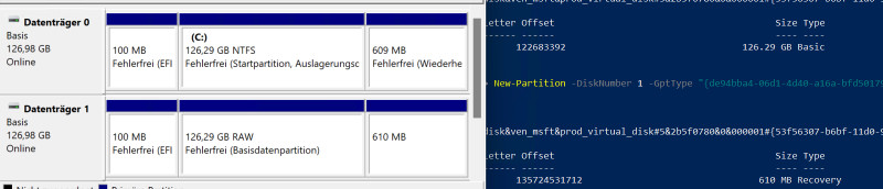 Mit folgenden Befehlen kann der Inhalt der Wiederherstellungspartition von Disk 0 auf Disk 1 ĂŒbertragen werden. DafĂŒr mĂŒssen erneut Laufwerksbuchstaben fĂŒr den Zugriff vergeben werden.