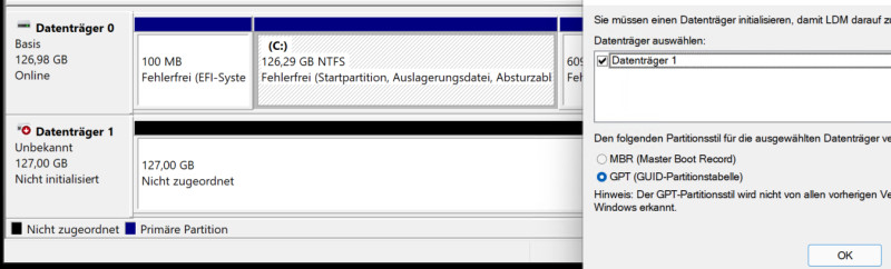 | Disk initialisieren | Neue Disk mit GPT initialisieren: Typ: Basic |
