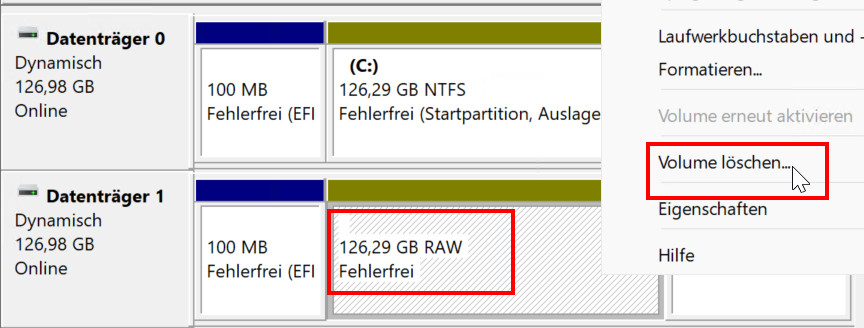 User: JĂŒrgen Hallo! Habe das Problem, dass ich immer eine Fehlermeldung bekommen?: 1. Spiegelung hinzufĂŒgen (C:) 2. DatentrĂ€ger 3 ausgewĂ€hlt (exakt Baugleiche SSD) 3. Fenster mit Fehler: Der Vorgang konnte nicht abgeschlossen werden, weil die Ansicht des DatentrĂ€gerverwaltungs-Snap-Ins nicht aktuell ist. Aktualisieren Sie die Ansicht mit der Auktualisierungsaufgabe. Wenn das Problem weiterhin besteht, schlieĂen sie das DatentrĂ€gerverwaltungs-Snap-In, und starten sie anschlieĂend das DatentrĂ€gerwerwaltungs-Snap-In oder den Computer neu. Hab die Aktualisierung schon versucht. Auch das rebooten hat nichts gebracht.