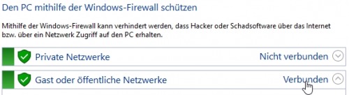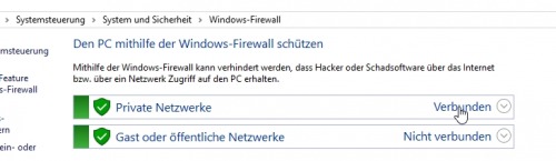 Ein Blick in das Menü der Windows-Firewall zeigt uns, welches Profil aktiv ist: