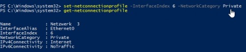 Der Befehl „get-netconnectionprofile“ zeigt alle verfügbaren Netzwerkadapter und deren verwendetes Firewallprofil: