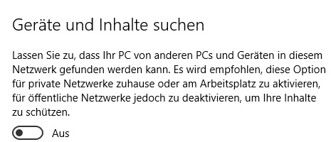 Die Einstellung „Geräte und Inhalte suchen“ auf „Ein“ aktiviert das private Netzwerkprofil,