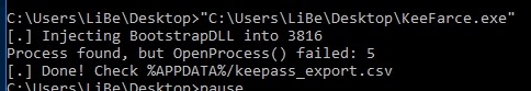 Das angesprochen Tool KeeFarce, kann zum Beispiel eine geöffnete KeePassdatenbank in eine nicht verschlüsselte csv Datei exportiert. Möglich ist dies durch DLL Injection. Das Tool bringt Keepass.exe dazu einen Export aller Benutzernamen und Passwörter in eine Textdatei zu erstellen.