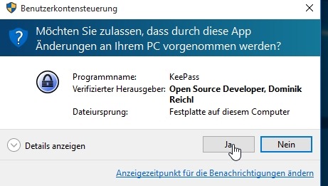 Die Benutzerkontensteuerung kann dabei auch dauerhaft in den Optionen der KeePass.exe eingestellt werden: