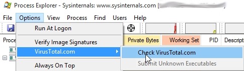 Mit dem kostenlosen Tool Process Explorer von Sysinternals (Microsoft) können alle laufenden Prozesse in Sekunden auf Viren geprüft werden. Dazu sendet Process Explorer die Hash-Werte der aktiven Tasks zu VirusTotal.com. VirusTotal vergleicht die Hash-Werte mit den gespeicherten Werten aller bekannten Virenscanner.