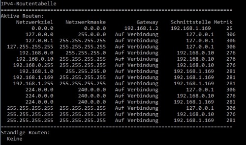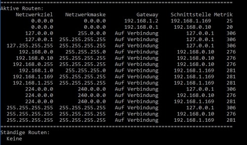 Mein WLAN-Router besitzt die IP: 192.168.1.2, der WLAN-Adapter die Adresse 192.168.1.169. Auch hier werden alle Anfragen, die sich in einem nicht angeführten Netz befinden, über den Eintrag 0.0.0.0 ins Internet geleitet. Spannend wird es, wenn ich jetzt zusätzlich das Netzwerkkabel wieder anstecke: