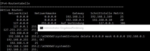 Mit dem Befehl: route delete 0.0.0.0 mask 0.0.0.0 192.168.0.1 können wir gezielt die Verbindung ins Internet für die Ethernetverbindung (Netzwerkkabel) löschen.