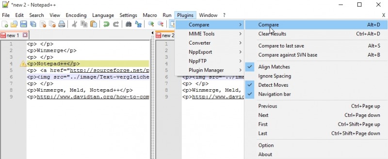 Zwei ähnliche Textdateien können dann mittels „Plugins“ und „Compare“ miteinander verglichen werden: