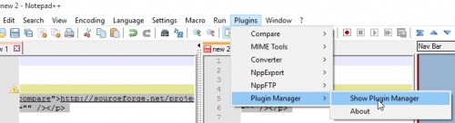 Mit dem Compare Plugin in Notepad++ können 2 Textdateien miteinander verglichen werden: Unterschiede werden dabei markiert. Das Plugin kann mittels Plugin Manager aktiviert werden. Dazu auf „Plugins“, „Plugin Manager“, „Show Plugin Manager“