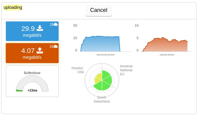 Folgender Test zeigt eine erhöhte Antwortzeit (Bufferbloat), das Internet fühlt sich während des Tests für alle Geräte entsprechend langsam an: