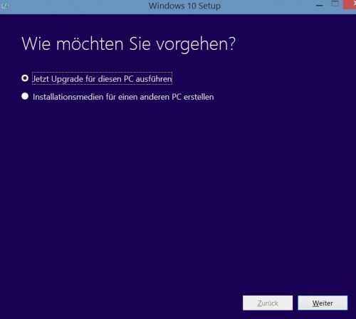Die 18MB große .exe Datei startet dazu den Download des Installationsmediums. Dazu gibt es 3 Optionen: