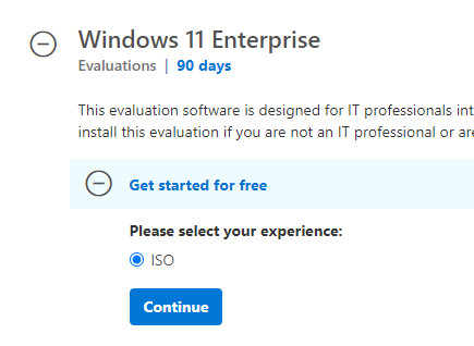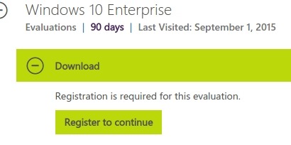 Nach einem erneuten Registrieren, diesmal für die Testversion, ich wähle Windows 10 Enterprise (nicht LTS) und 64 bit, kann eine ISO.Datei heruntergeladen werden: 10240.16384.150709-1700.TH1_CLIENTENTERPRISEEVAL_OEMRET_X64FRE_DE-DE.ISO