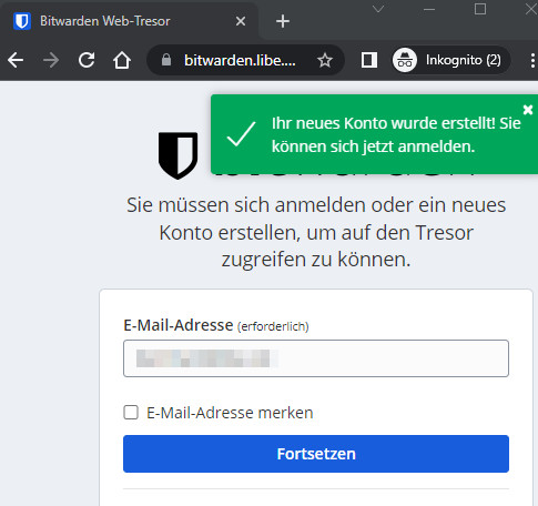 Nach dem Start des Containers meldet sich Bitwarden auf der angegebenen Domäne.