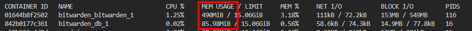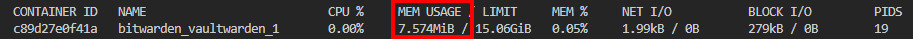 Ein Blick auf den Ressourcenverbrauch mittels docker stats zeigt den wesentlich kleineren Fußabdruck von Vaultwarden: