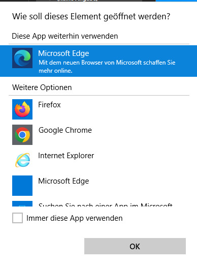 An dieser Stelle kann mit „Immer diese App verwenden“ einfach ein anderer Browser als Standardbrowser fixiert werden.