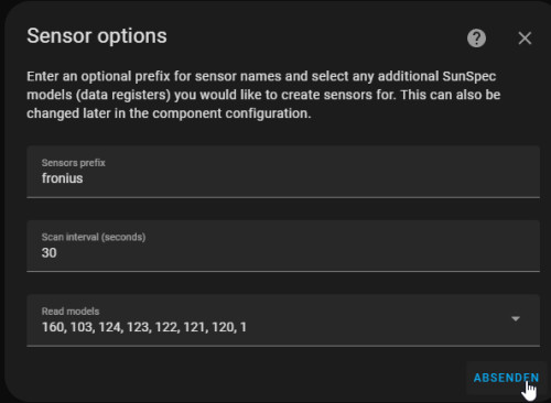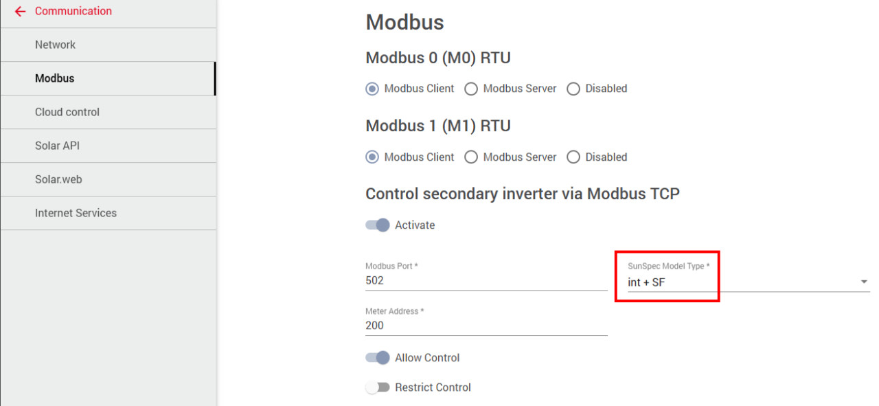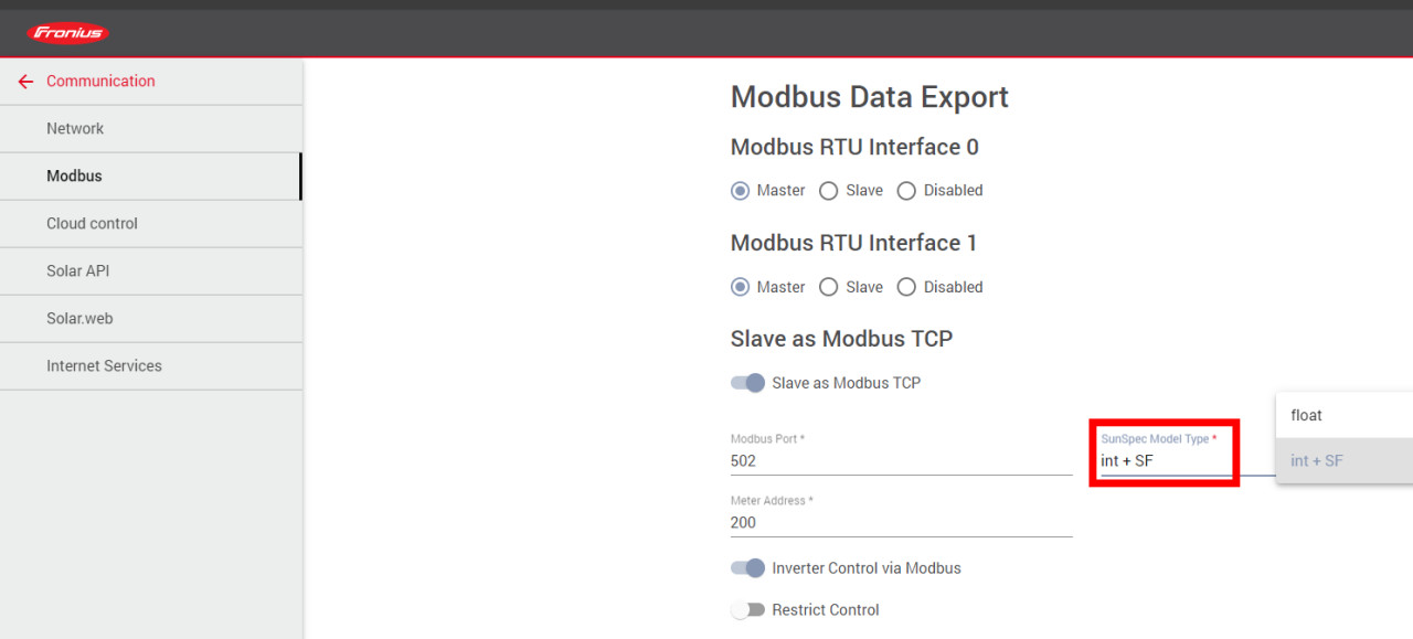 Für Modbus gibt es zwei verschiedene SunSpec Model Type: "int + SF" und "float":