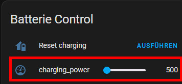 Den Input-Helfer (Nummer) hast du angelegt: input_number.charging_power ? Habs nochmal kontrolliert: Mein Script schaut identisch aus und wenn ich den Helfer auf 500 stelle, lädt mein Akku mit 500 Watt. Charge Limit sollte die maximale Ladeleistung limitieren .. Also, wenn der Input-Helfer auf 500 wird die Ladeleistung auf 500 Watt limitiert.