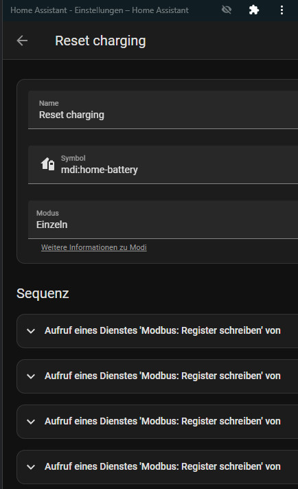 Hallo Robert, sorry da hätte ich schon früher nochmal genauer testen sollen. Ich habe das Template "alias: Force charging" anhand der Dokumentation nochmal neu aufgebaut und hier aktualisiert: Eventuell kannst du damit nochmal testen, ob es jetzt funktioniert. Wäre super, wenn du kurz ein Feedback geben könntest, ob es mit dem neuen Template klappt?
