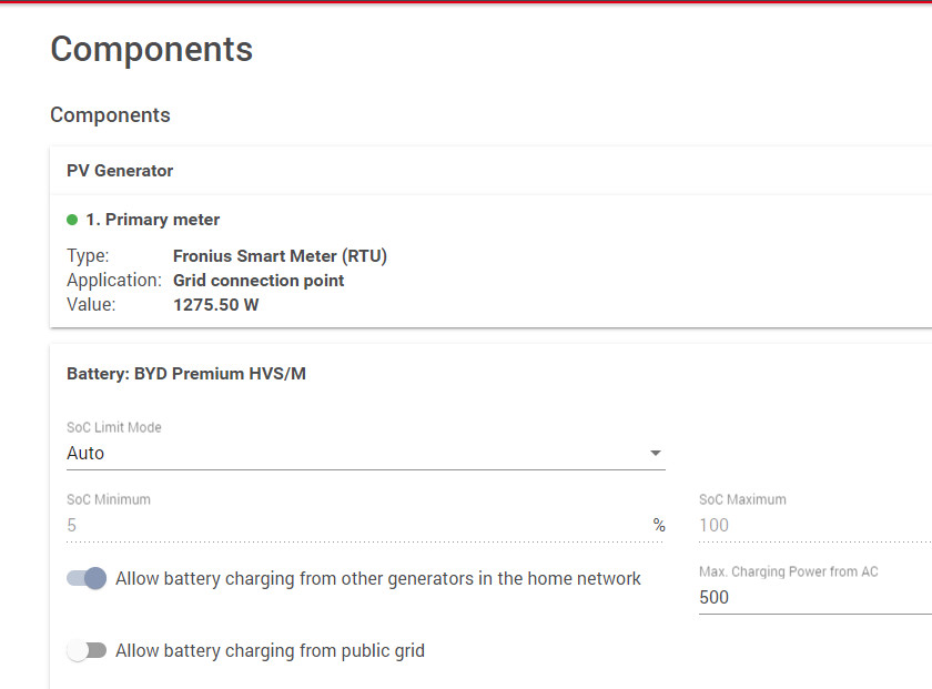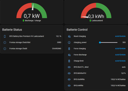 Hey, ich habe leider das gleiche Problem. Folgendes ist mir aufgefallen: Wenn der Akku mittels Skript erzwungen geladen wird und ich danach das Skript "Charge-limit" ausführe, wird egal welche Zahl unter input_number.charging_power erfasst war die Ladeleistung auf 500 w gestellt. Wenn ich das Skript "Charge-limit" als erstes ausführe und danach erst "Force charging". Klappt es manchmal (z. B. bei Eingabe von 2000) und manchmal nicht (z. B. bei Eingabe von 3570). Mache ich/wir (gruß an Andre) etwas falsch? Gibts hier eine Lösung? LG Robert