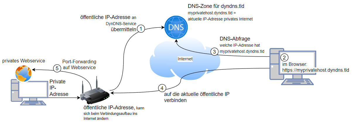 Wer vom Internet auf ein privates Netzwerk zugreifen will, benötigt dafür eventuell einen DynDNS-Service (dynamisches DNS, DynDNS oder DDNS). Sollte der Internetanbieter bei jeder Verbindung eine andere IP-Adresse vergeben, kann ein DynDNS-Service darauf reagieren und den Zugriff über einen gleichbleibenden DNS-Namen ermöglichen.