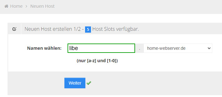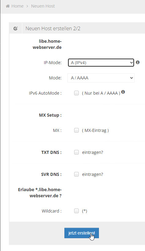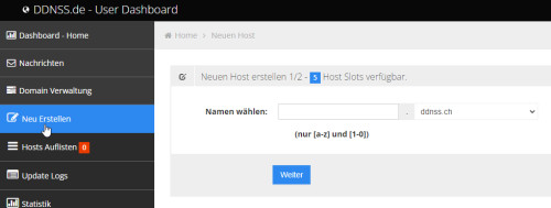 Zuletzt habe ich den DynDNS-Service von DDNSS.de verwendet. Zunächst muss auf der Webseite des Anbieters ein Konto erstellt und die E-Mail-Adresse bestätigt werden. Im Anschluss ist es bereits möglich einen neuen Host (Domain-Namen) anzulegen: