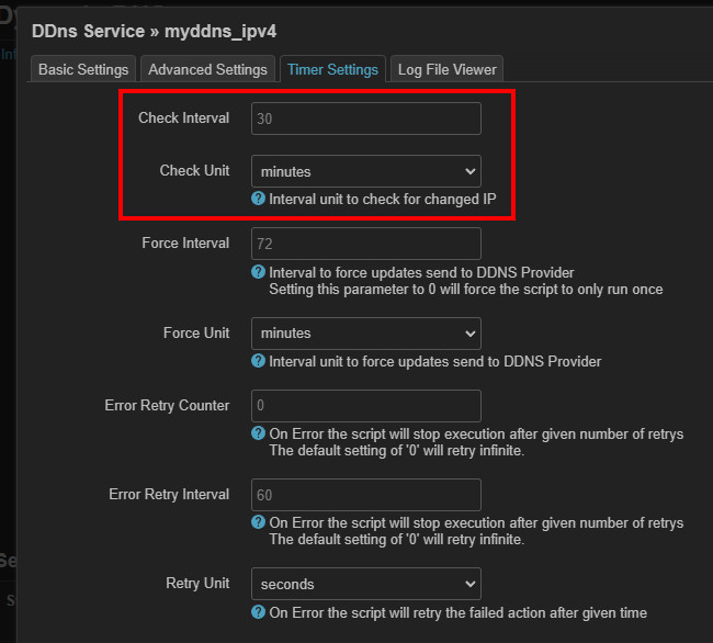In den Timer Settings ist das Check Interval hinterlegt. Wie oft die IP kontrolliert werden soll, per Default alle 30 Minuten: