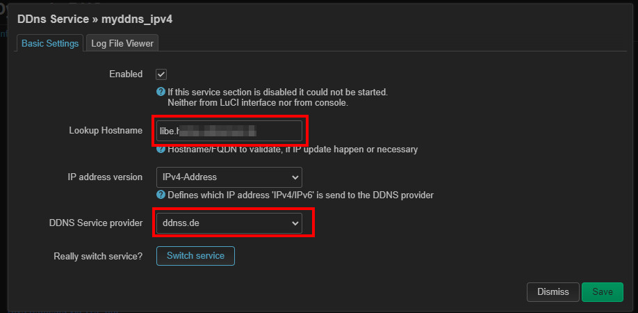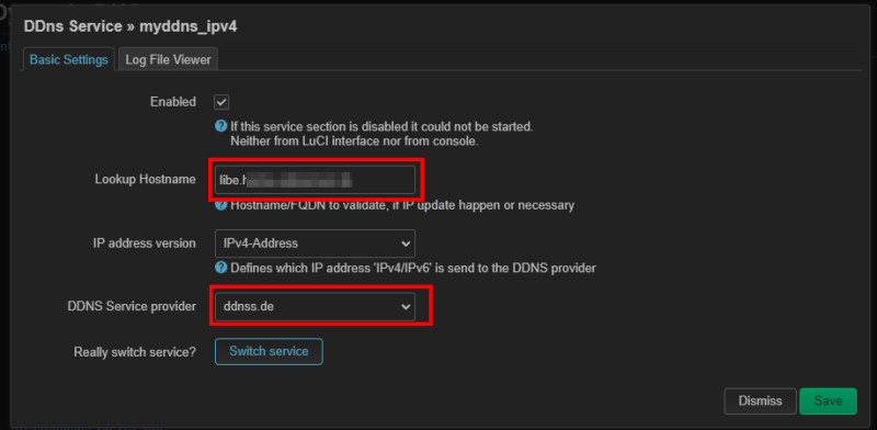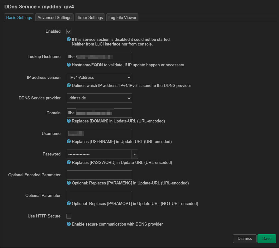 Für die Konfiguration sind Vorlagen für unzählige DDNS Service Provider vorhanden. Ich habe die Funktion mit dem DynDNS-Anbieter ddnss.de getestet: