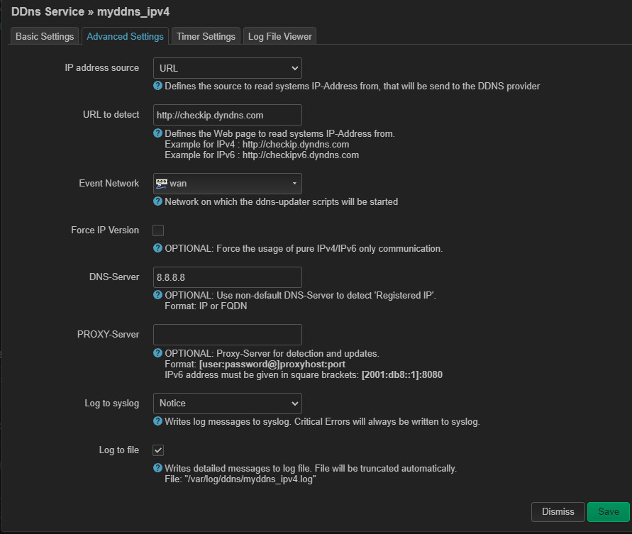 Bei meinem Setup besitzt der Router am WAN-Interface keine öffentliche IP-Adresse, da ich den Router vom Provider vorgeschaltet habe, daher musste ich die Einstellungen "IP Address source" auf "URL" ändern: