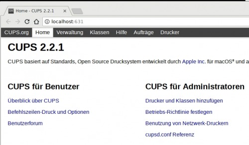 Nach dem Start des Containers kann der Druckserver im Browser verwaltet werden: localhost:631 oder IP-Adresse:631