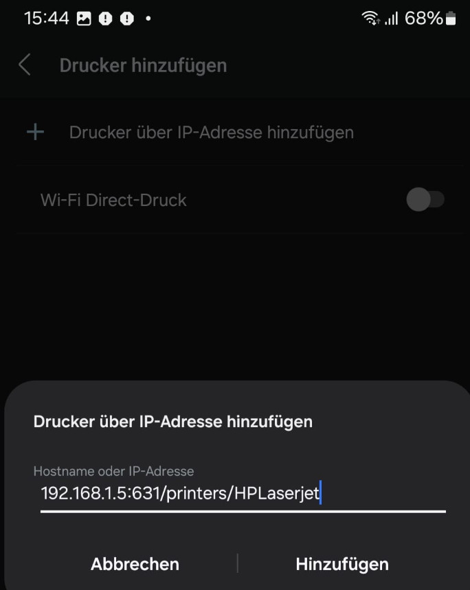 Für den Zugriff von Android reicht es, den freigegebenen Drucker einmalig über die Ip-Adresse hinzuzufügen: