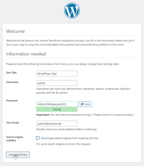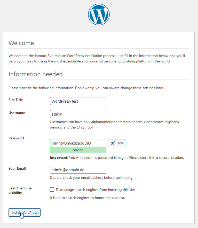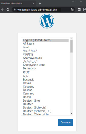 Beim Aufruf der angegebenen Domain (https://wp.domain.tld) meldet sich das WordPress-Setup. Für einen Testbetrieb auf dem eigenen Rechner und dem Aktivieren von Port 83 kann der Aufruf zudem direkt ohne Internet über die URLs http://localhost:83 oder http://ServerIP:83 erfolgen.
