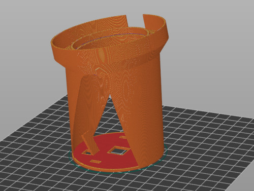 I wanted to print the housing in one part and without support. To minimize reflections from the light on the glass of the water clock, I tilted the object by 9° and shielded the light with a small wall. For attaching the ESP, I printed two cutouts to be able to fix it with cable ties.
