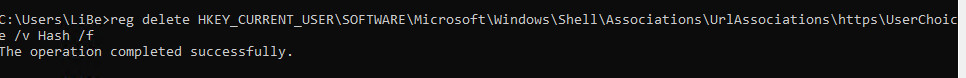 reg delete HKEY_CURRENT_USER\SOFTWARE\Microsoft\Windows\Shell\Associations\UrlAssociations\https\UserChoice /v Hash /f