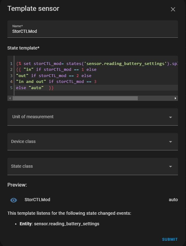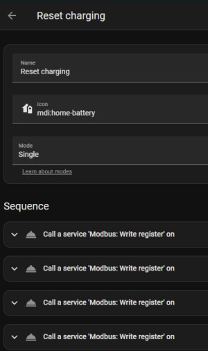 The sensor "sensor.reading_battery_settings" reads all relevant Modbus registers and serves as the basis for the template sensors mentioned later:
