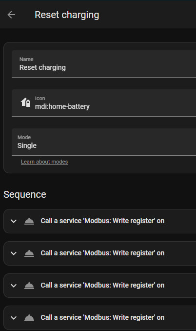To control the charging behavior, I have put together buttons for the following operating modes in a Home Assistant Lovelace dashboard: