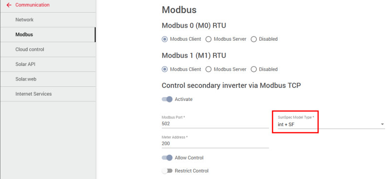 There are two different SunSpec Model Types for Modbus: "int + SF" and "float":