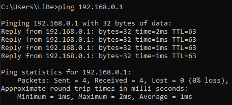 Reply from 192.168.0.1: bytes=32 time<1ms TTL=128