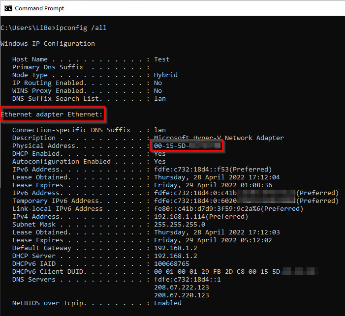 The MAC address is a unique address of the network adapter. The MAC address can be displayed using the getmac command or with ipconfig /all.