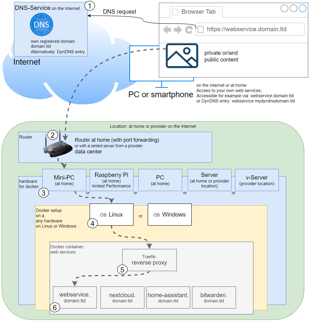 As a basis for Nextcloud I originally used the following GitHub project and later adapted it: https://github.com/ichiTechs/Dockerized-SSL-NextCloud-with-MariaDB . The project basically consists of two files, which I describe in adapted version here. The main reason for the adaptation was to separate the reverse proxy from the Nextcloud setup, allowing multiple web services to run with a respective SSL certificate. The Nextcloud installation is running on hardware in my case, at my home.