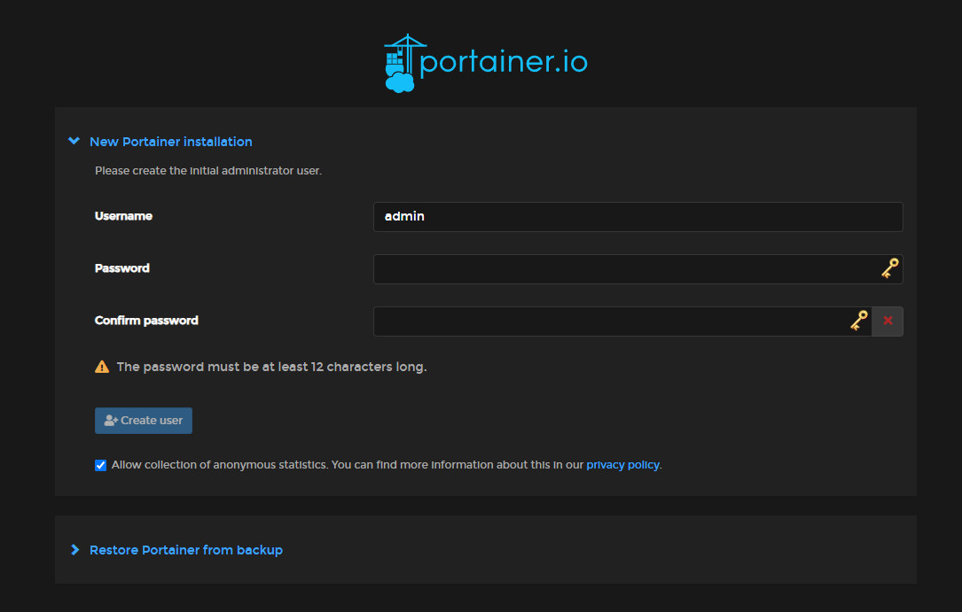 The portainer GUI can now be started using the IP address of the server and port 9443 used in the configuration. In my case the server has the IP address 192.168.1.176, so the call is done via https://192.168.1.176:9443/.