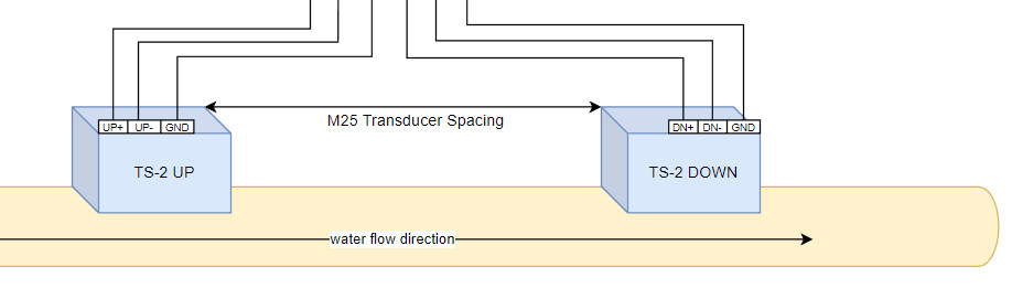 Transducer Mounting is the variant how the sensors are mounted on the pipe. V is the preferred variant for pipes between 15 and 200mm. The sensors are mounted on the same side of the pipe at the distance of the next menu item M25 "Transducer Spacing":