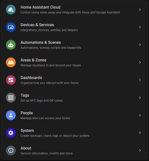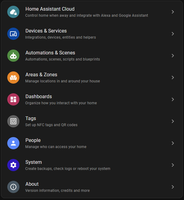 Detailed adjustments to the system configuration can be made in the "Settings" menu item. From the integration of new devices to the management of automations, all options are centrally accessible here.