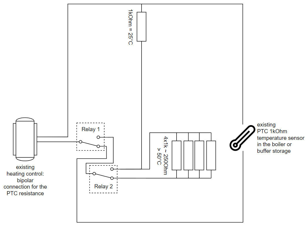 If the two relays are not active, the original PTC temperature sensor is used. Activating the first relay interrupts the PTC and replaces it with the optional resistors, which corresponds to a temperature of over 50°C and deactivates the hot water heating. If I switch on the 2nd relay, the resistors for the 250Ohm value are bridged and the remaining 1kOhm resistor simulates 25°C for the heating: Time for hot water preparation.