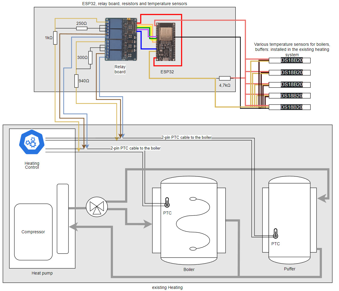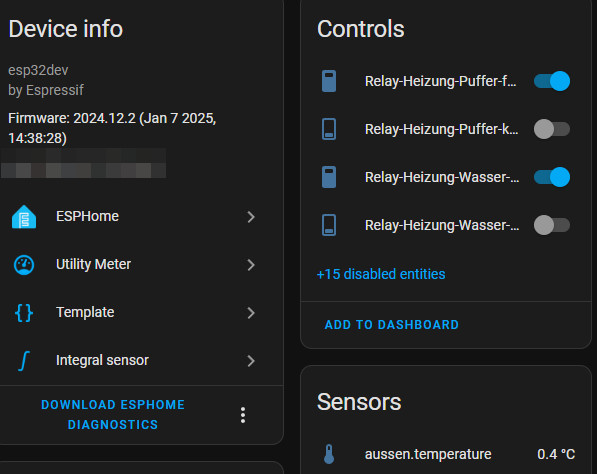 - DS18B20 temperature sensors for heating and outside temperature, see: DS18B20 - Temperature sensors in ESP-Home